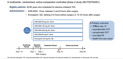 SHR-2004是AG庄闲医药自主研发的一种抗FXI的人源化单克隆抗体,通过阻断内源性凝血途径的级联反应过程发挥抗凝作用。SHR-2004-201研究是一项多中心、随机、开放标签、阳性对照的II期临床研究(NCT05752461),旨在评价择期单侧TKA患者单次皮下注射或静脉滴注SHR-2004注射液预防VTE的疗效和安全性。